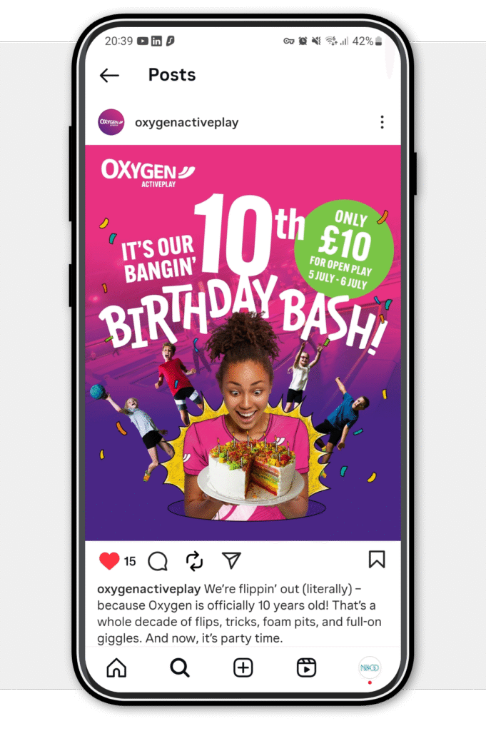 As the sole, in-house creative at Oxygen, I would produce various on-brand campaign assets across digital and print touch points to market the milestone anniversary. Utilising photography and illustration, I set about putting a member of the company’s Hero Crew front and centre, with an expression of excitement and wonder to grab the attention of the viewer, conveying the moments of WOW that the experiences at Oxygen deliver.
